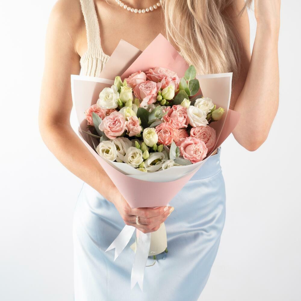 Красивое соцветие миниатюрных бутонов кустовой розы и эустомы делают этот букет прекрасным подарком по-любому поводу. Силикатный окрас позволяет сочетать кустовую розу с практически любым цветком. Данный букет собран для вас в классическом стиле, в нежной упаковке. Дарите улыбки своим близким, а мы вам в этом поможем