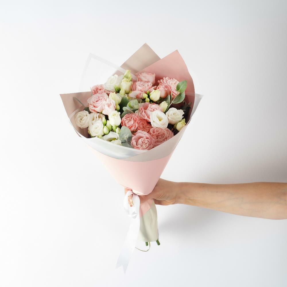 spray peony roses – 3 шт. Eustoma – 2 шт. packaging – 2 шт. gift massage card – 1 шт. care instruction – 1 шт.