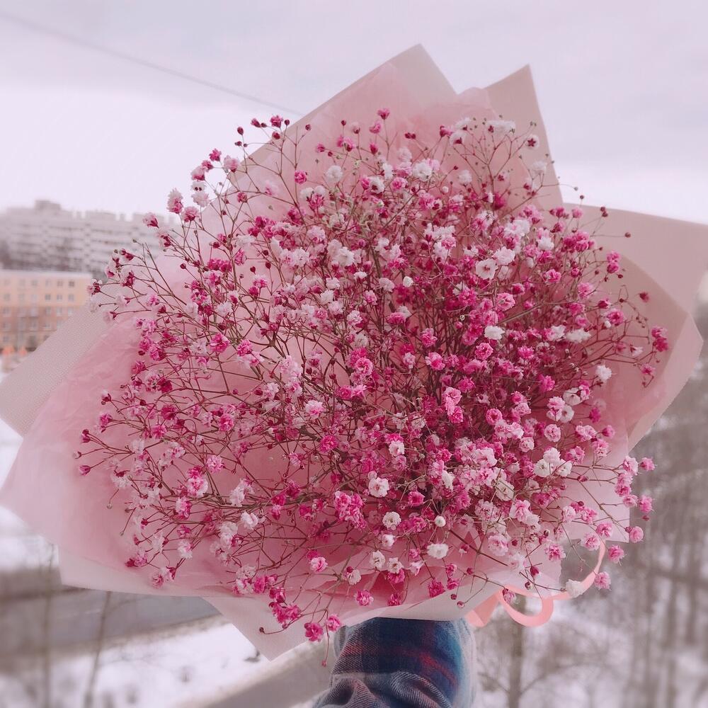 Лента атласная – 1 шт.Упаковка дизайнерская – 1 шт.Гипсофила розовая – 1 шт.