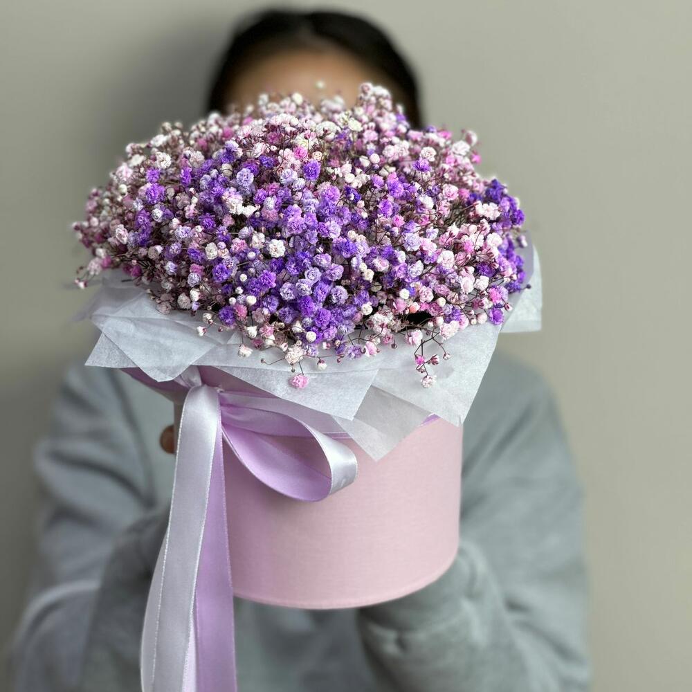 “Сиреневый туман” – композиция из гипсофилы в шляпной коробке