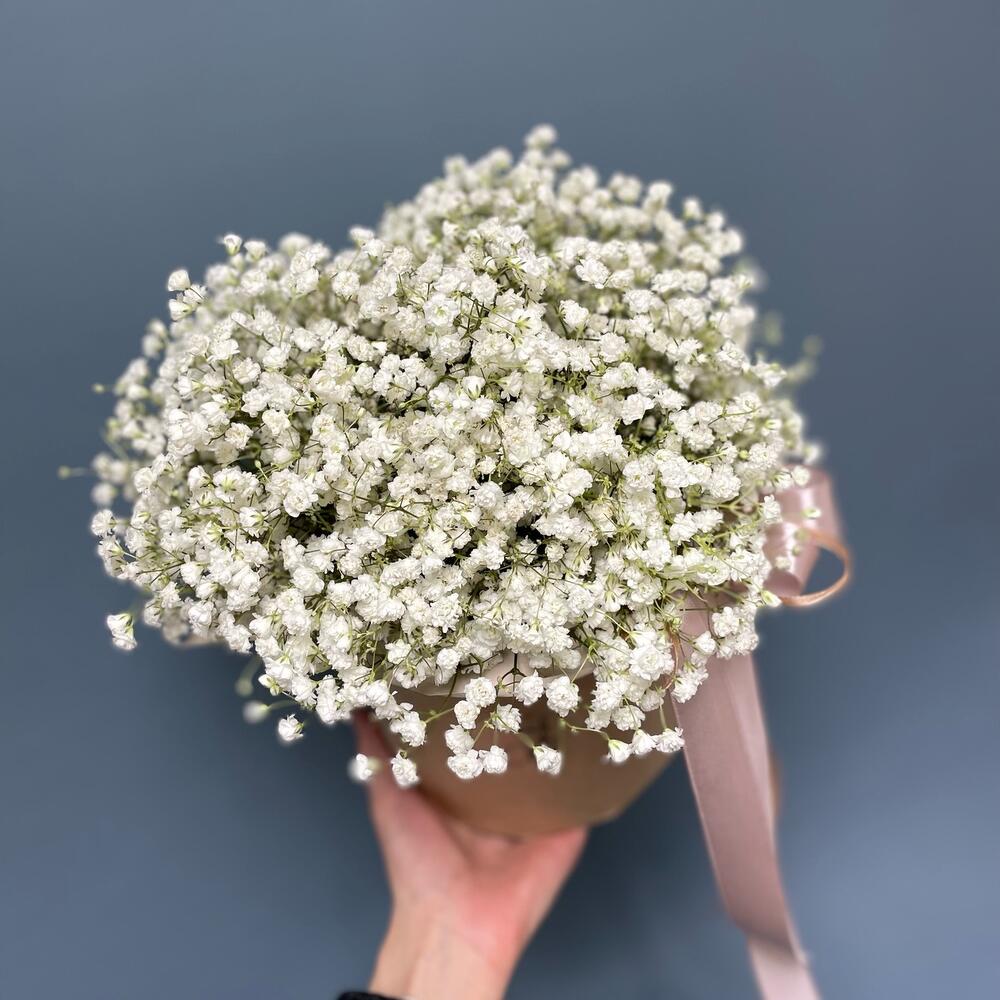 Гипсофила – 9 шт.Коробка шляпная – 1 шт.Оазис флористический – 1 шт.Лента атласная – 2 шт.