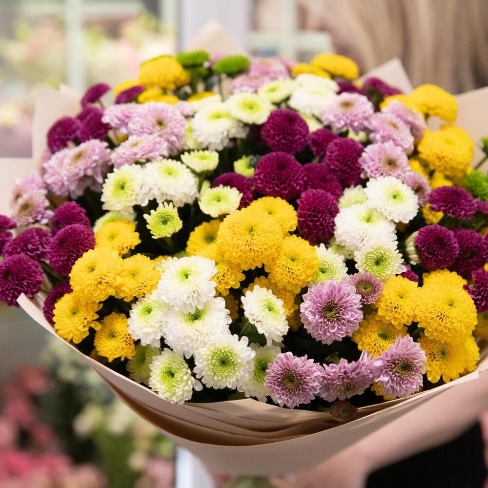 Хризантема кустовая Сантини – 25 шт.Открыточка с вашими пожеланиями – 1 шт.Дизайнерская упаковка – 1 шт.