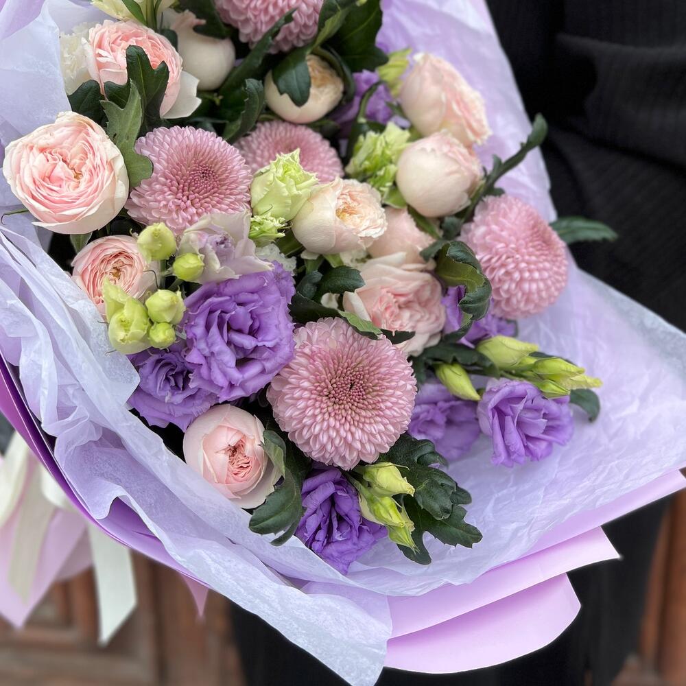 роза пионовидная кустовая мэнсфилд парк – 3 шт.Хризантема момоко – 5 шт.эустома лавандовая – 3 шт.Эустома белая махровая – 1 шт.Тишью белое – 2 шт.Пленка матовая – 3 шт.Лента атласная – 2 шт.