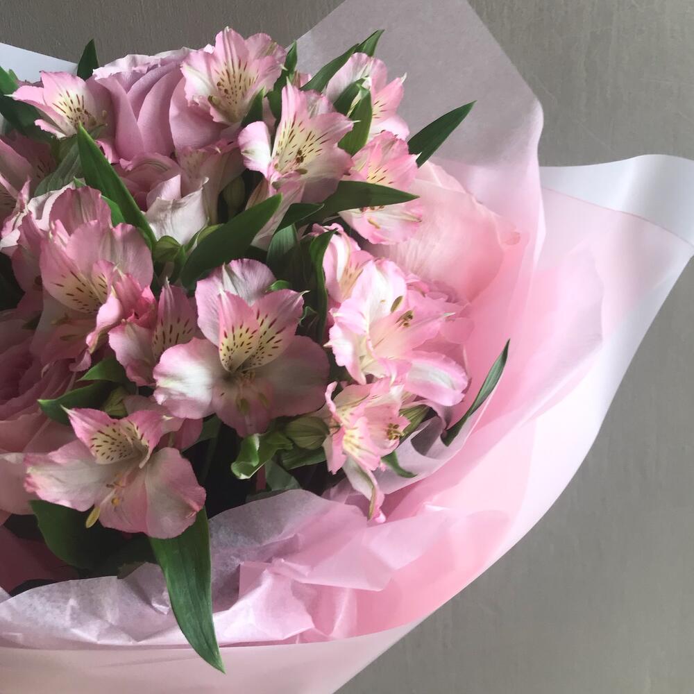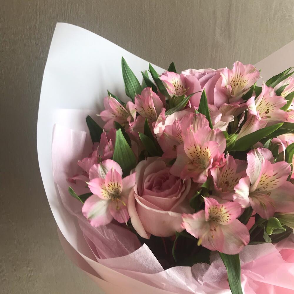 Альстромерия – 6 шт.Роза – 5 шт.Лента атласная – 2 шт.Тишью – 1 шт.Пленка матовая – 1 шт.