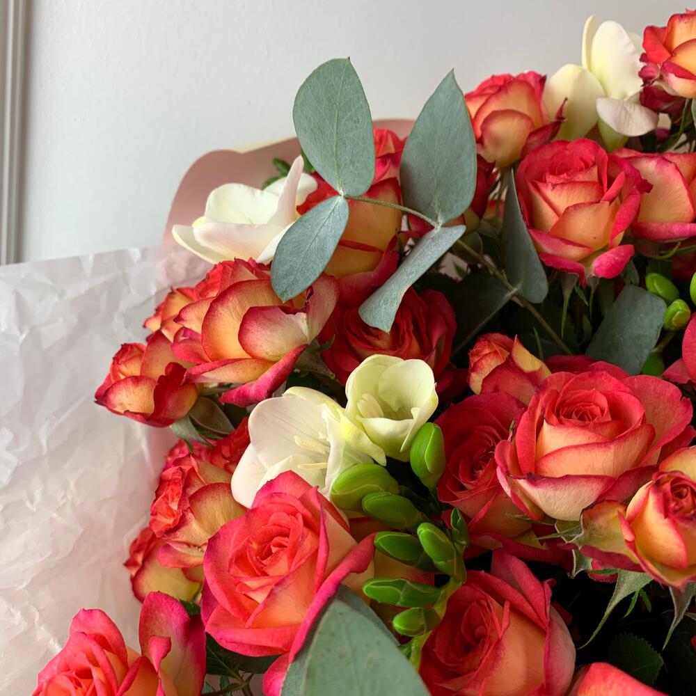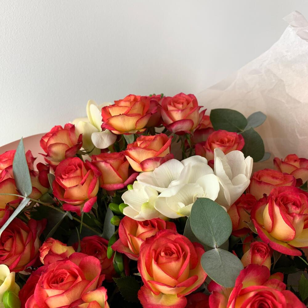 Букет «Плямя чувств» с кустовыми розами и фрезиями