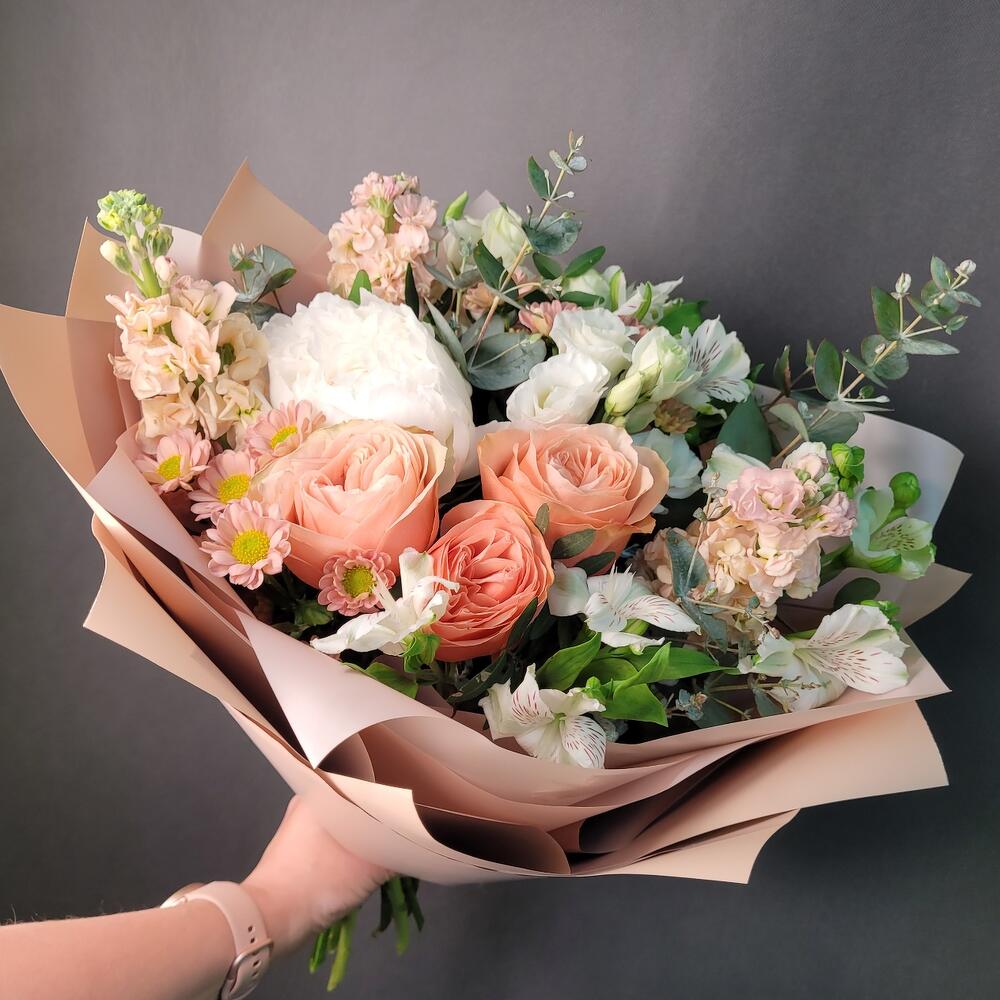 Роза Эквадор – 3 шт.Маттиола – 3 шт.Пион – 1 шт.Альстромерия – 3 шт.Сантини – 2 шт.Эустома – 2 шт.Эвкалипт – 2 шт.Упаковка дизайнерская – 1 шт.Лента атласная – 1 шт.