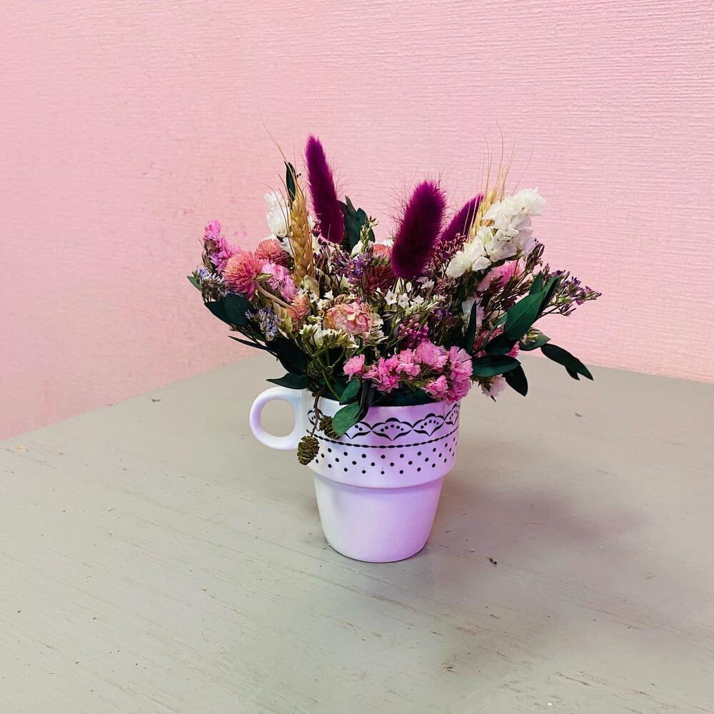 Роза сухоцвет – 1 шт.роза из мыла – 1 шт.Пшеница – 2 шт.Лимониум – 1 шт.Эвкалипт – 2 шт.Озотамнус – 1 шт.Лагурус – 3 шт.Статица – 2 шт.Оазис флористический – 1 шт.Кашпо керамическое – 1 шт.