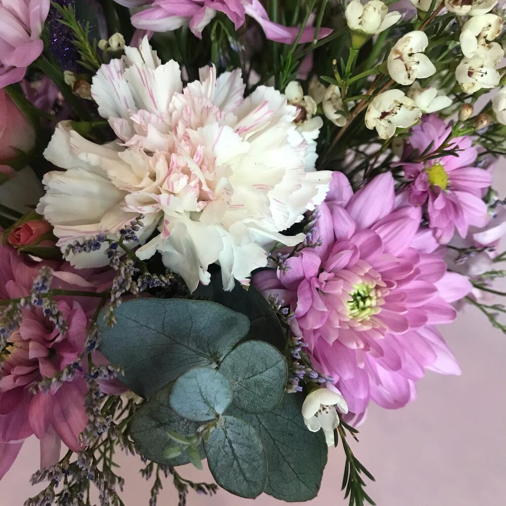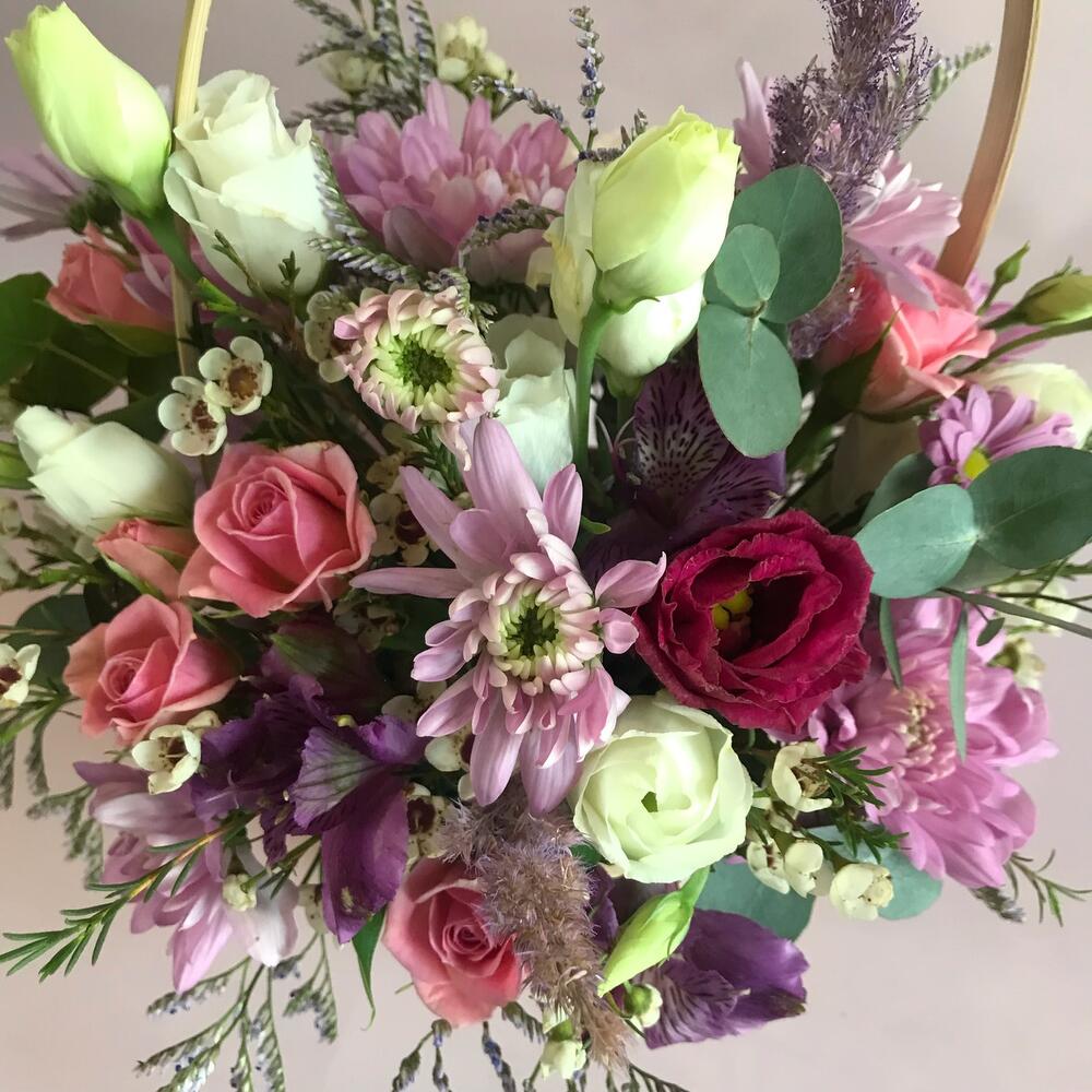 Альстромерия – 1 шт.Ваксфлауэр – 3 шт.Лизиантус – 3 шт.Лимониум – 3 шт.Роза кустовая – 1 шт.Хризантема кустовая – 2 шт.Эвкалипт – 2 шт.Корзина плетеная – 1 шт.декор трава – 2 шт.