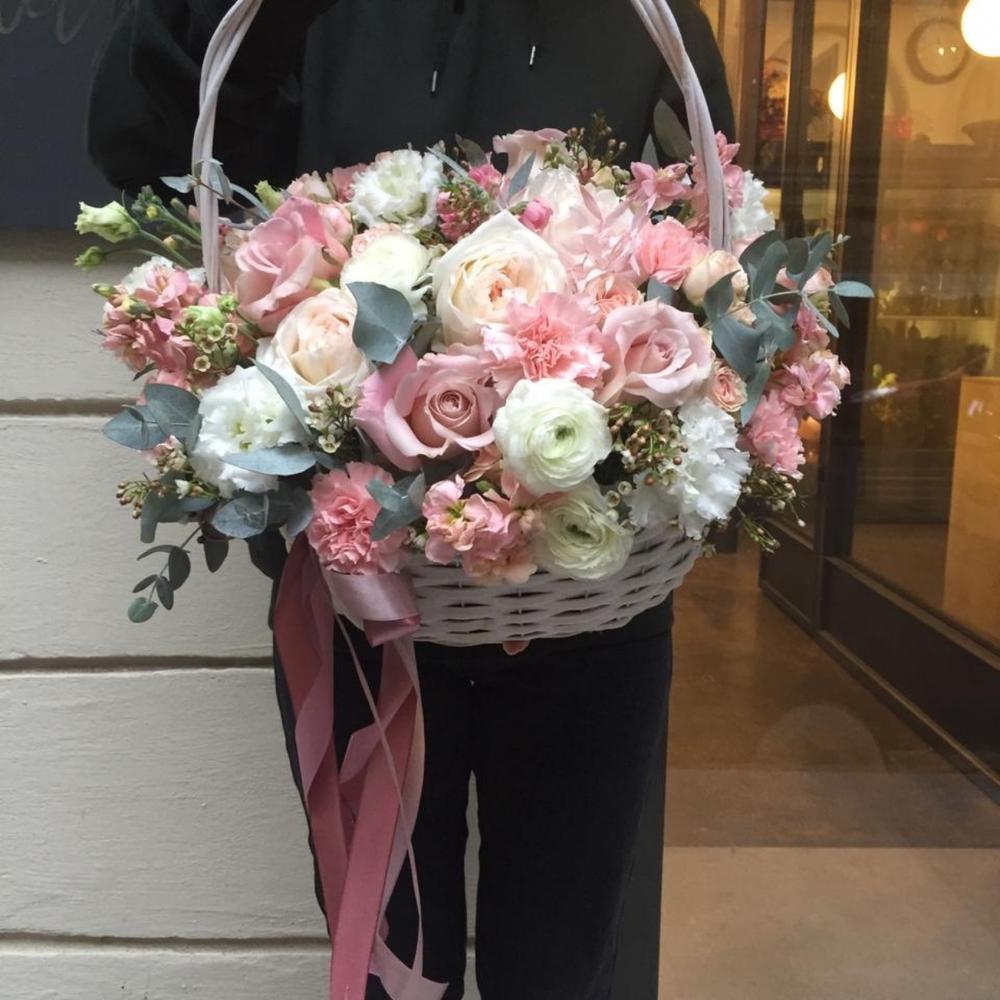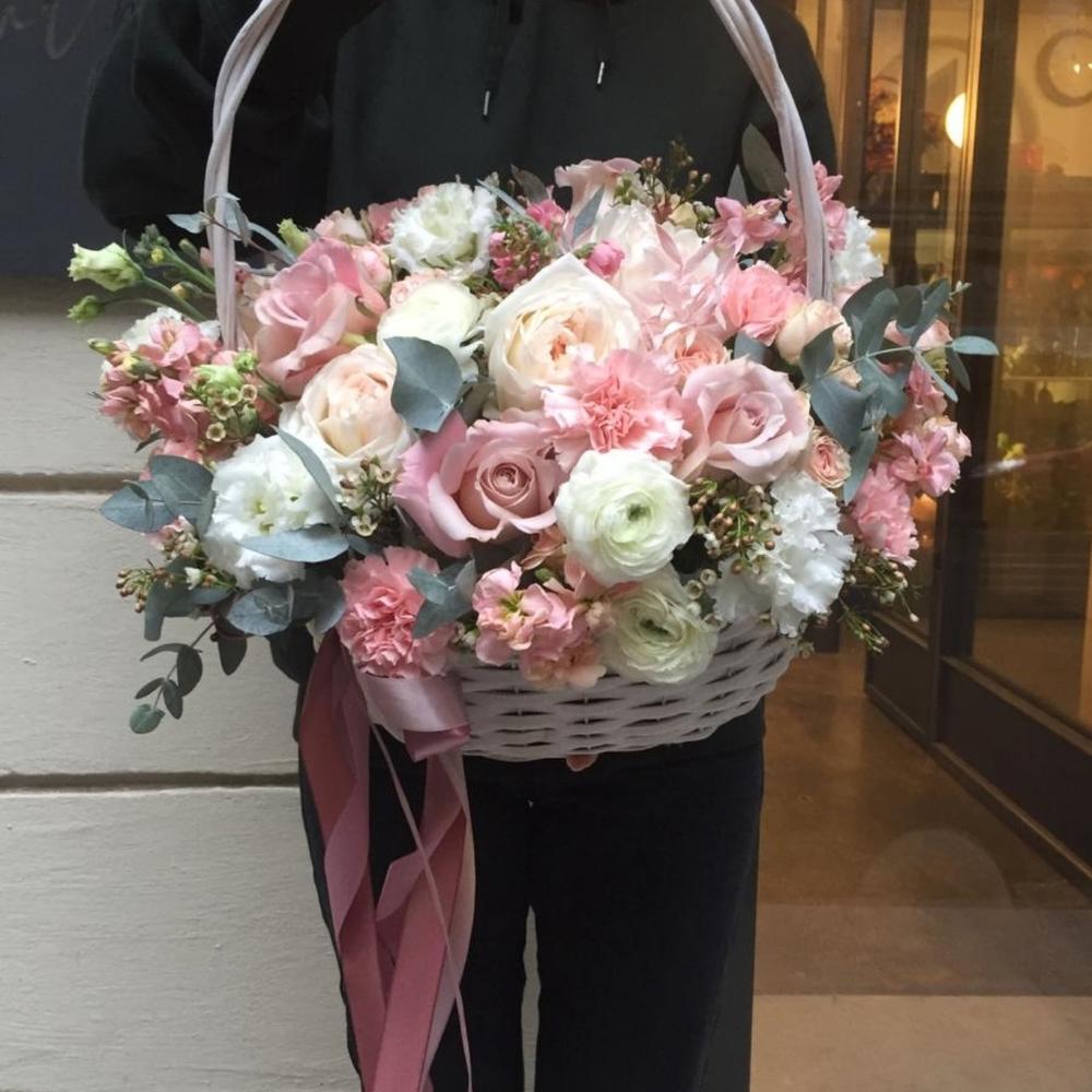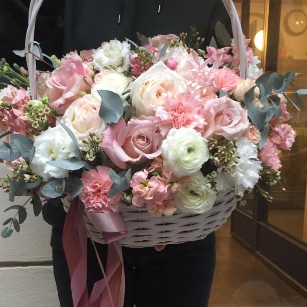 Роза – 15 шт.Ранункулюс – 3 шт.Эустома – 10 шт.Ваксфлауэр – 7 шт.Гвоздика – 10 шт.Эвкалипт – 10 шт.Корзина – 1 шт.Оазис флористический – 2 шт.Лента атласная – 345 шт.