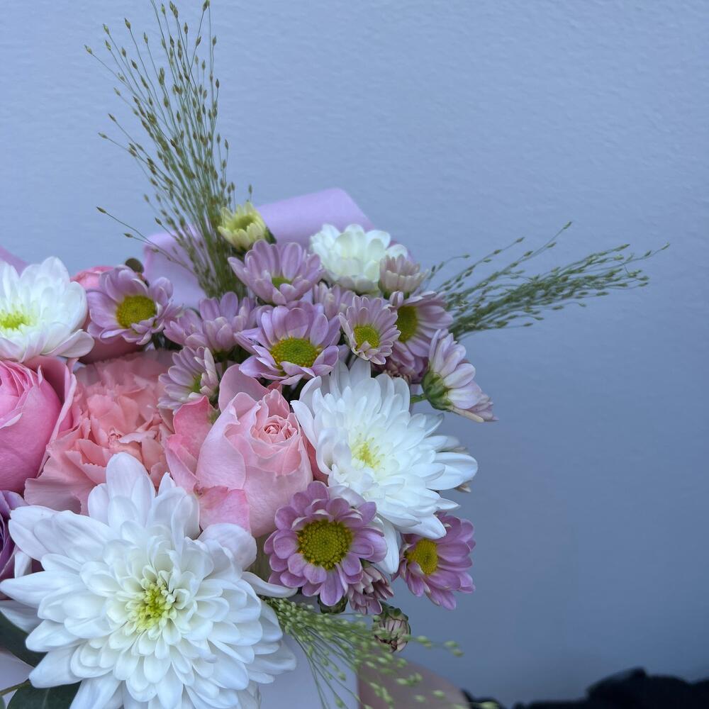 Коробка шляпная – 1 шт.Оазис флористический – 1 шт.Тишью – 1 шт.роза кения 40 см – 2 шт.Диантус – 1 шт.Сантини – 1 шт.Паникум – 2 шт.Роза пионовидная кустовая – 1 шт.Эвкалипт – 1 шт.
