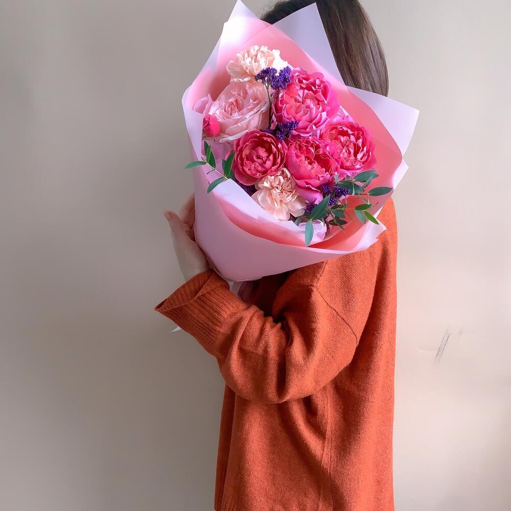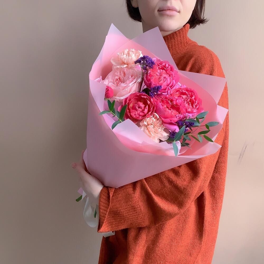 Яркий букет-комплимент с эффектным пионовидным составом.