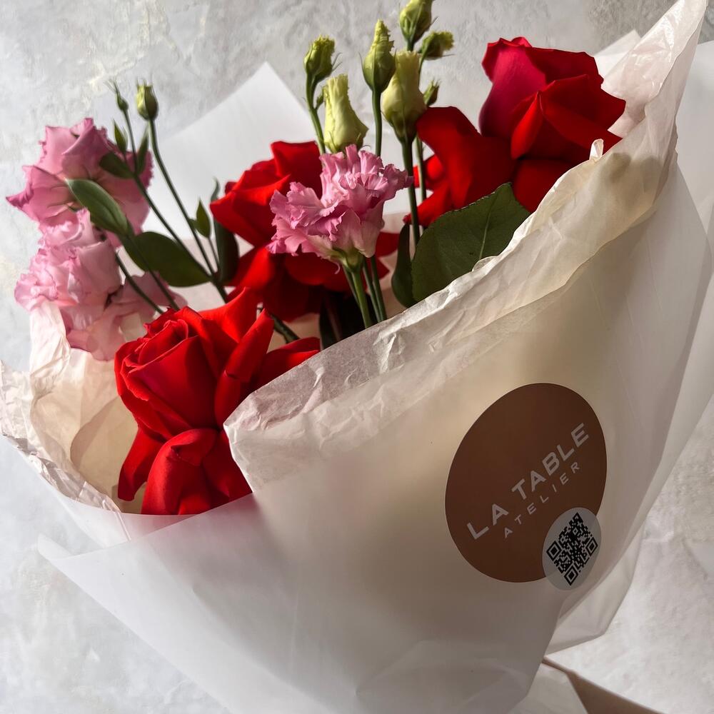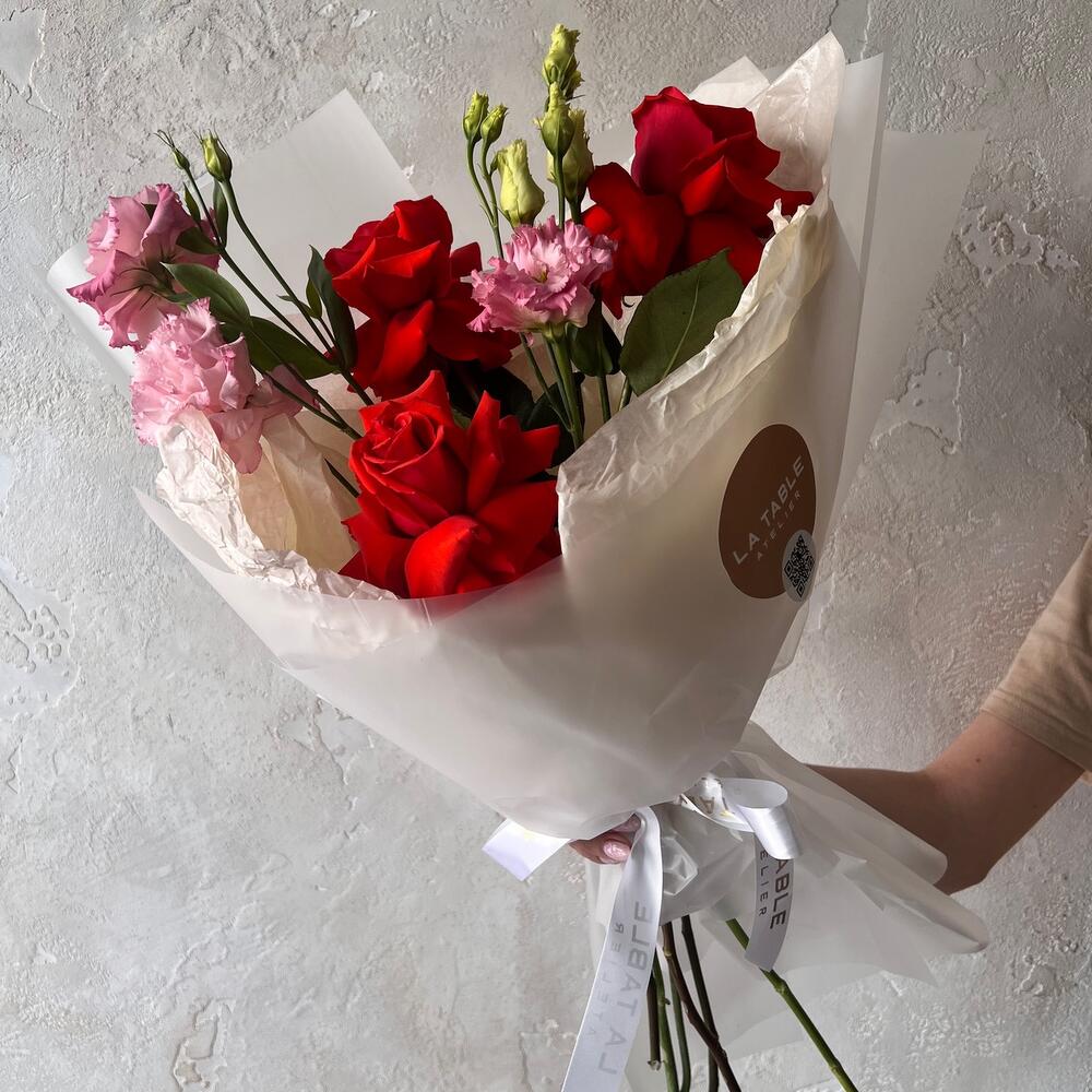 Лизиантус махровый розовый – 2 шт.Роза французская – 3 шт.Авторская упаковка – 1 шт.