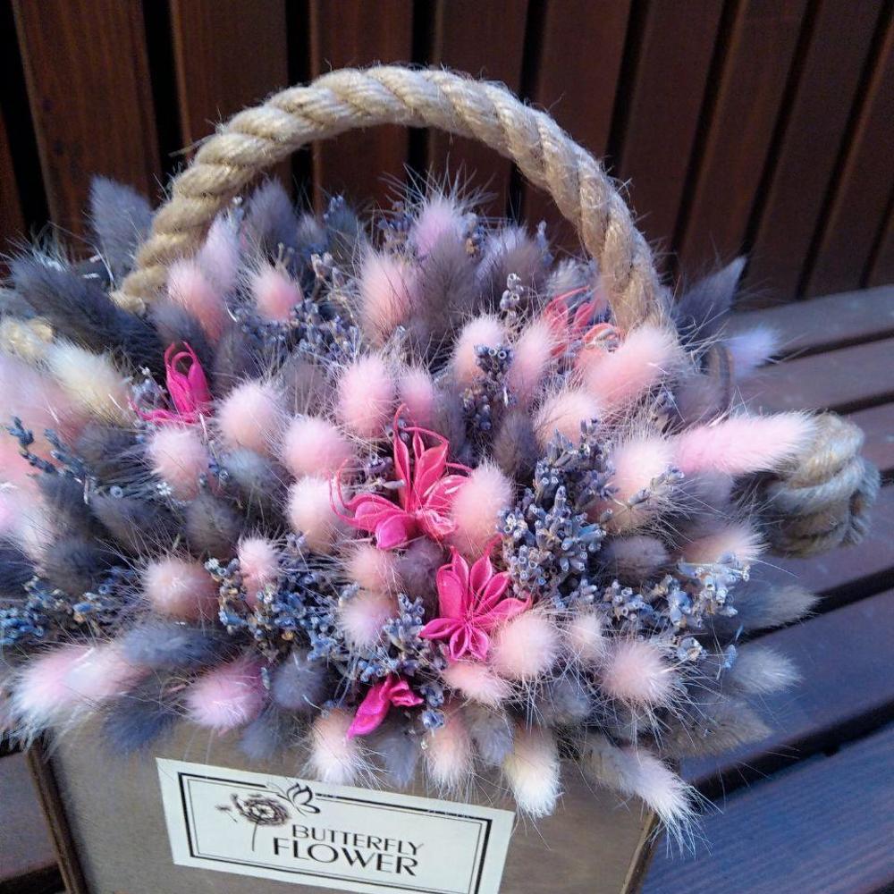 Букет из сухоцветов - лагуруса, лаванды и нигеллы в стильном деревянном ящике "Краски Майорки"