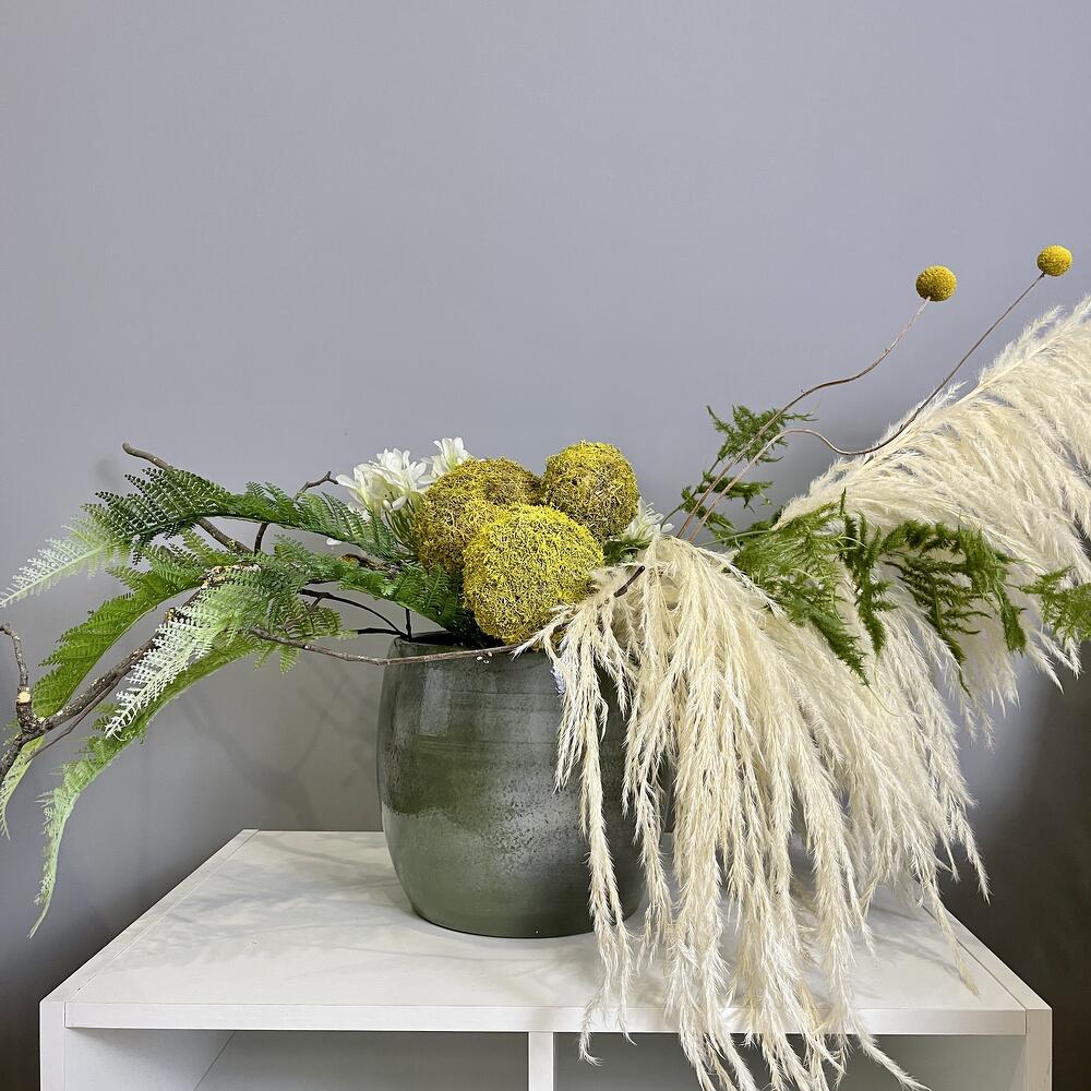 картадерия сухоцвет – 2 шт.плюмозус искусственный – 2 шт.агапантус искусственный – 3 шт.коряга натуральная – 1 шт.шары из натурального мха – 3 шт.краспедия сухоцвет – 2 шт.папоротник искусственный – 4 шт.Кашпо керамика – 1 шт.